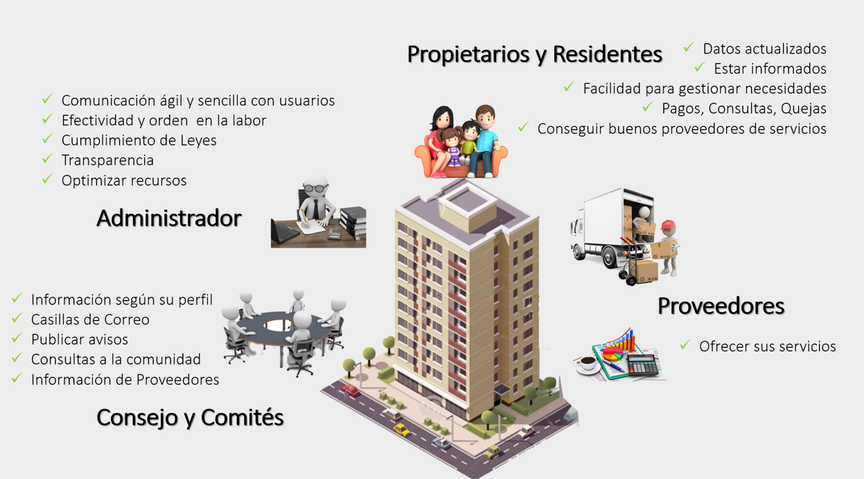 VoxPH© presenta múltiples beneficios para toda la comunidad que interactúa en una Unidad Residencial: Propietarios, Residentes, Administradores, Consejos, Comités, Guardas de Seguridad y Proveedores o Contratistas. Mediante la centralización de la información en una plataforma web con acceso simultáneo por los todos interesados, mejora la visibilidad y transparencia en la gestión de los recursos materiales y la eficiencia de los encargados de administrar. VoxPH© establece canales oficiales para comunicar noticias, circulares, documentos, minutas de seguridad, quejas y solicitudes. Además permite la realización de encuestas a los propietarios y residentes sobre temas de interés común.